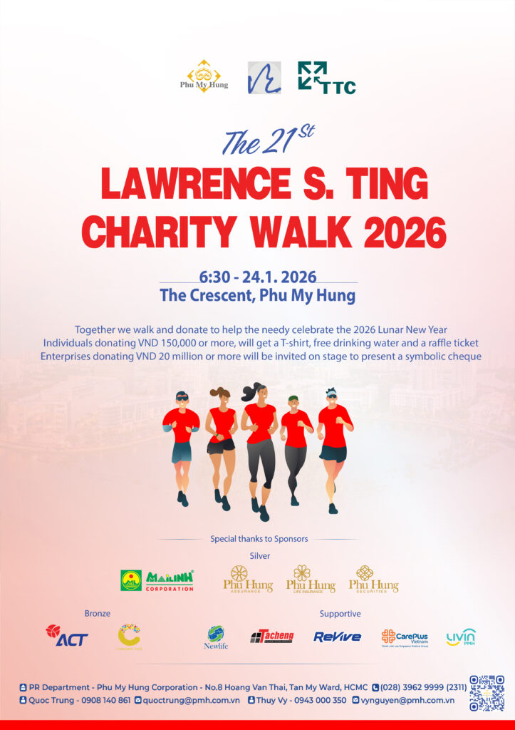 The vibrant atmosphere of charitable footsteps and the spirit of sharing will once again be reignited at the 21st Lawrence S. Ting Charity Walk, taking place at 6:30 AM on January 24, 2026, at The Crescent Strip, Phu My Hung (Tan My Ward, Ho Chi Minh City). The walk is organized by Phu My Hung Corporation in coordination with the People’s Committees of Tan My, Tan Hung, Tan Thuan, Phu Thuan, and Binh Dong Wards, as well as the Communes of Nha Be, Binh Chanh, and Binh Hung. The event aims to raise funds to support disadvantaged households in welcoming Tet 2026.