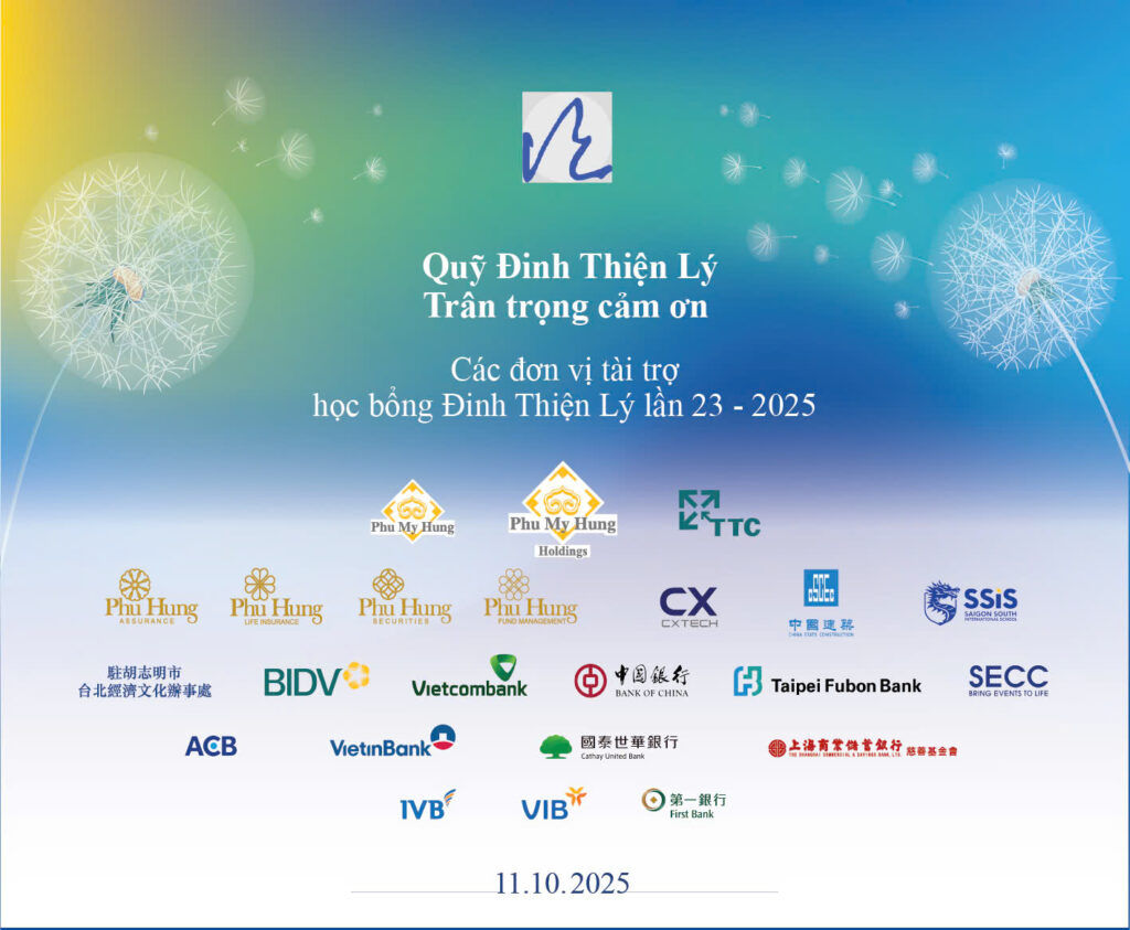 These meaningful scholarships are made possible through the generous support and partnership of numerous sponsors, including: Taipei Economic and Cultural Office in Ho Chi Minh City, Phu My Hung Asia Holdings Group, Phu My Hung Development Corporation, Tan Thuan Corporation, Phu Hung Financial Group, China State Construction Engineering (Southeast Asia), CX Technology Vietnam, Saigon South International School (SSIS), Saigon Exhibition and Convention Center (SECC), Banks: BIDV, Vietcombank Nam Sai Gon, Bank of China, Taipei Fubon, Shanghai Bank, ACB, VietinBank, Cathay United, Indovina, VIB, SinoPac, Hua Nan, Mega ICBC, First Commercial, CTBC, Enterprises: New Life, ACT Telecom… and many other organizations and individuals.