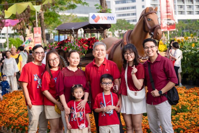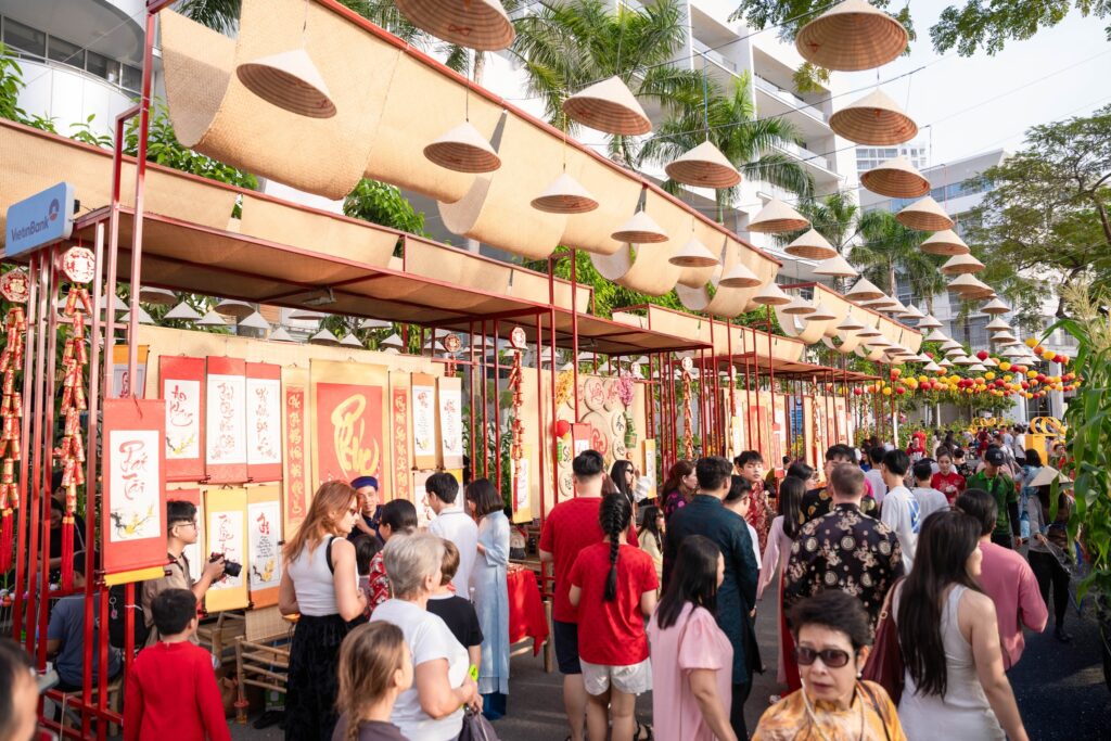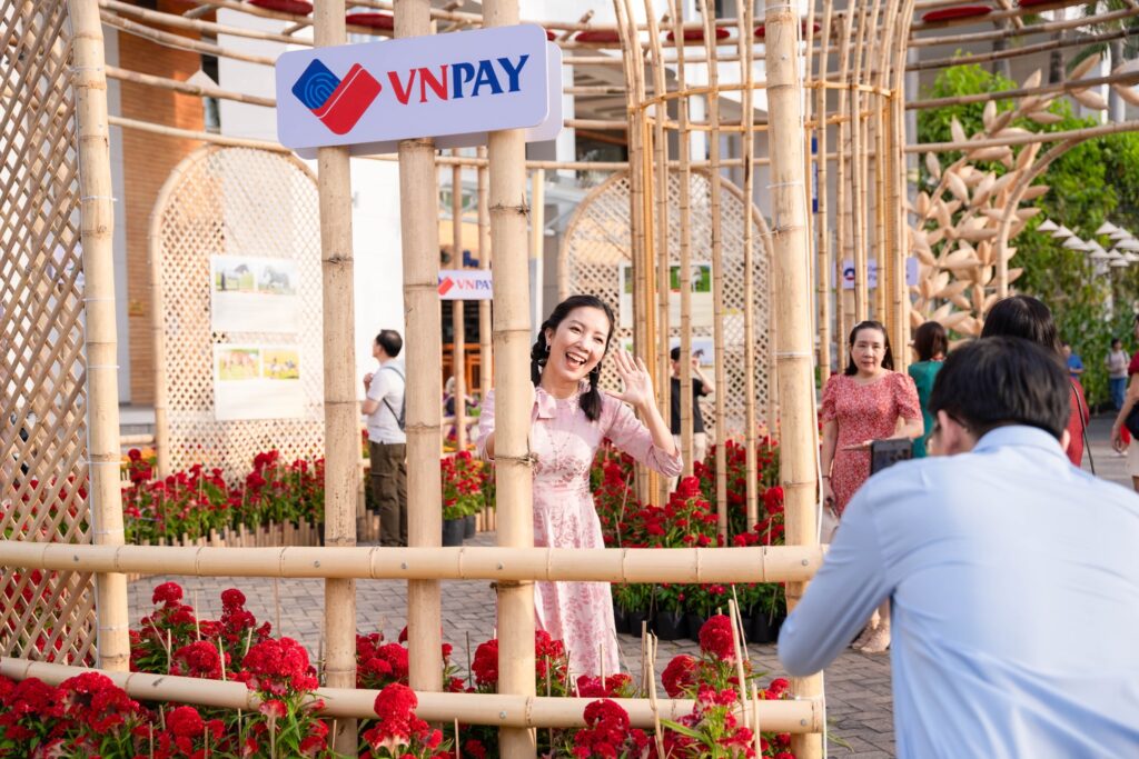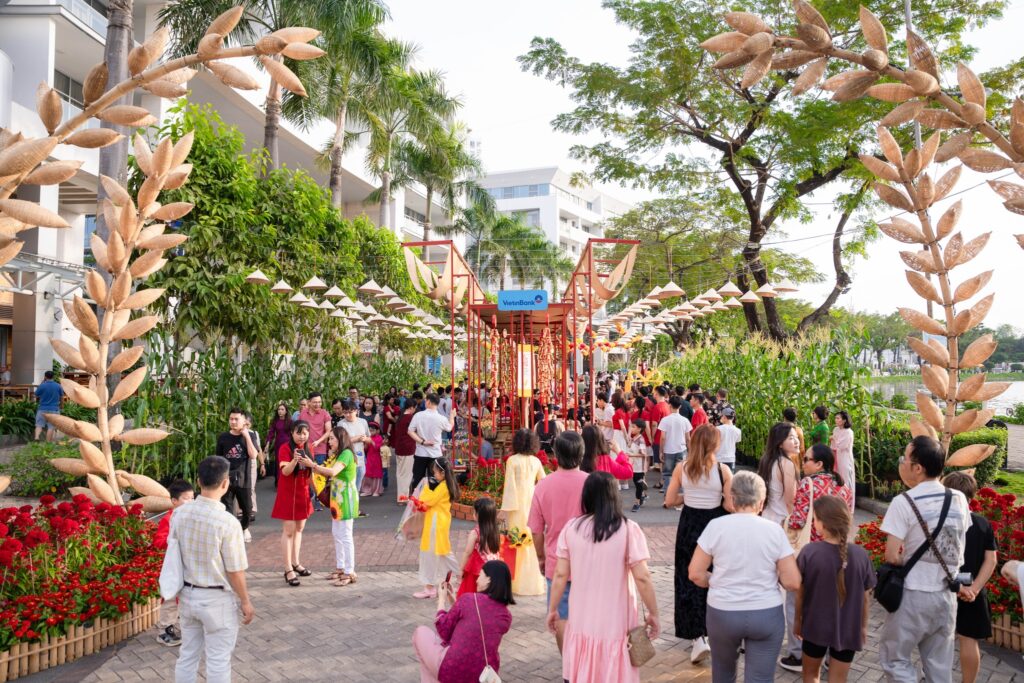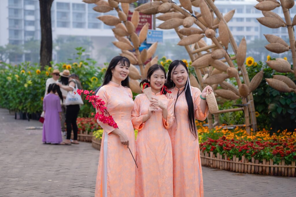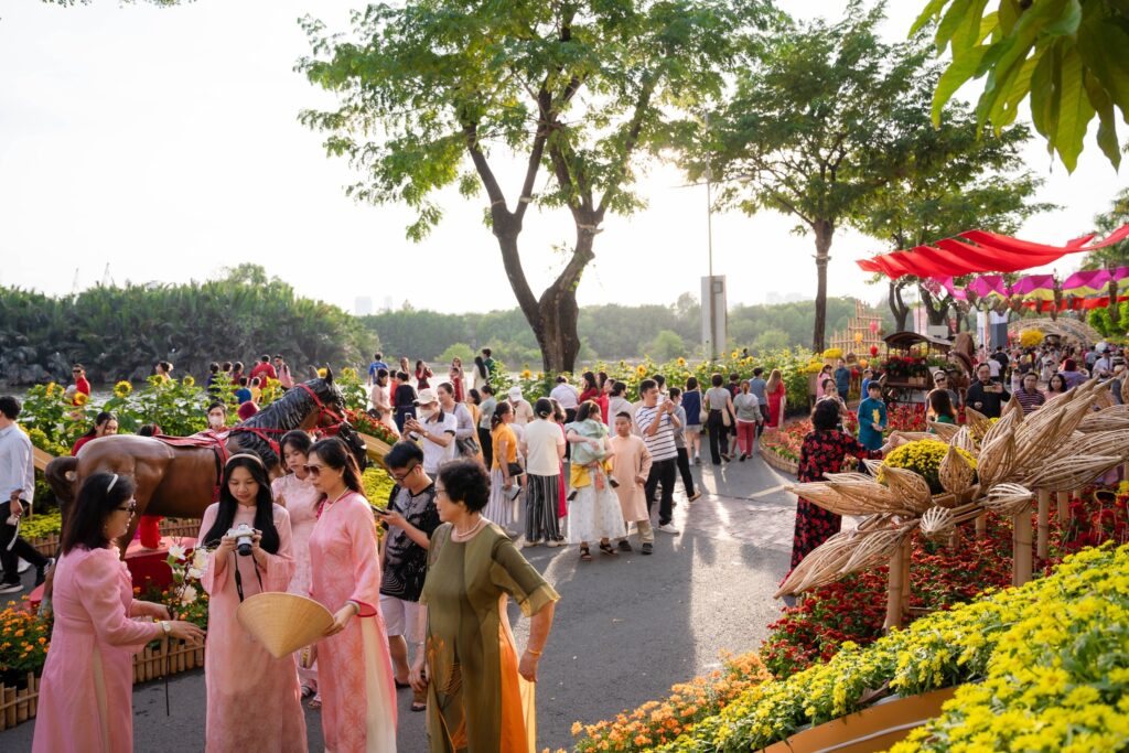 Ngay từ sớm, khu Hồ Bán Nguyệt đã trở nên nhộn nhịp với hình ảnh các gia đình, nhóm bạn và bạn trẻ diện trang phục áo dài rực rỡ, hào hứng du xuân. Không gian ngập tràn sắc hoa, kết hợp cùng các tiểu cảnh được đầu tư công phu, tạo nên nhiều điểm dừng chân hấp dẫn cho người tham quan.