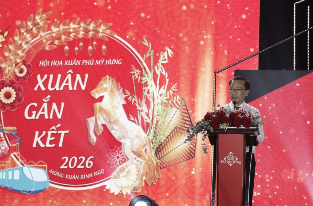 Phát biểu tại lễ khai mạc, đại diện Công ty Phú Mỹ Hưng nhấn mạnh, Hội hoa xuân Phú Mỹ Hưng Tết Bính Ngọ 2026 năm nay với chủ đề “Xuân Gắn Kết” mang đến không gian trang trí ngập tràn sắc xuân mà còn là lời chúc về sự đồng lòng, kết nối giữa các vùng đất, các thế hệ, các cộng đồng cư dân để cùng bước vào một năm mới thịnh vượng.