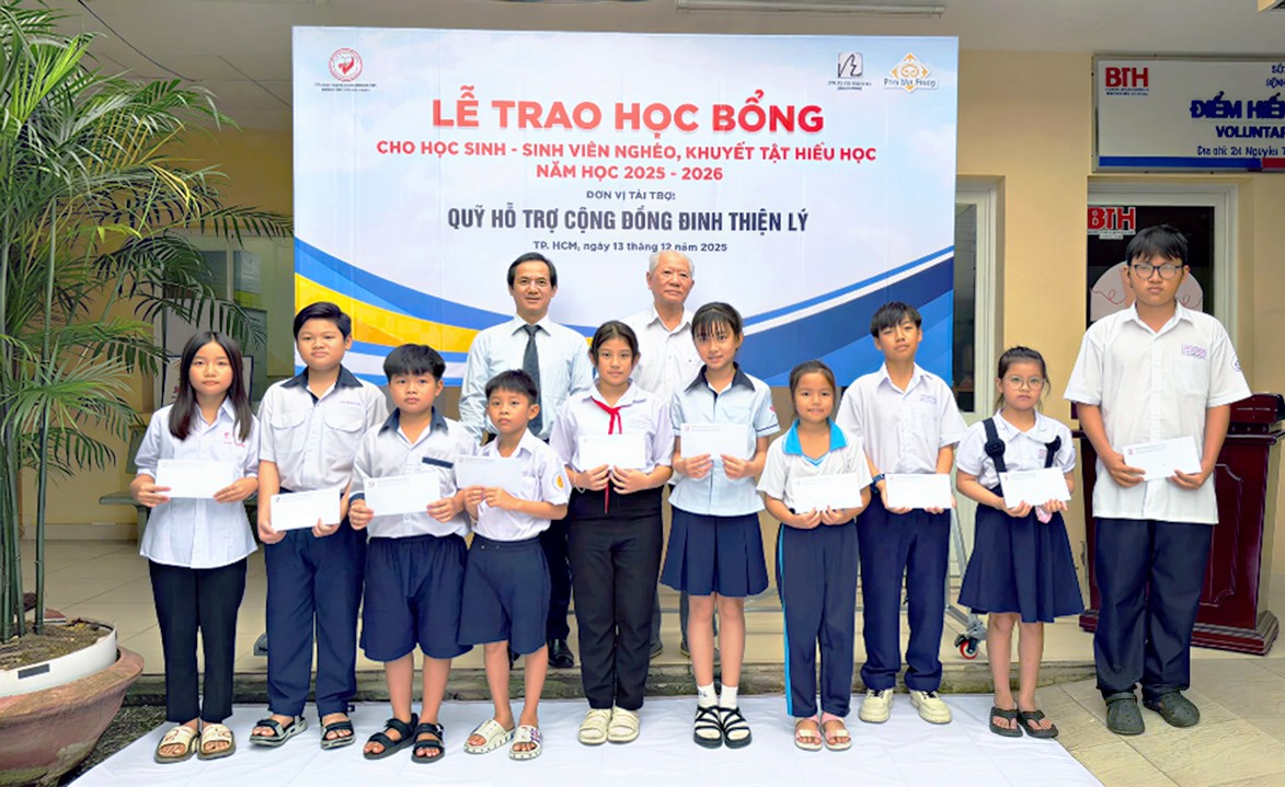 Sáng ngày 13/12/2025, Hội Bảo trợ Bệnh nhân nghèo TP.HCM đã tổ chức “Lễ trao học bổng cho học sinh – sinh viên nghèo hiếu học” năm học 2025 – 2026. Tại buổi lễ, 395 suất học bổng với tổng kinh phí 500 triệu đồng đã được Hội trao tặng cho các em học sinh, sinh viên nghèo, khuyết tật hiếu học tại TP.HCM và các tỉnh Cà Mau, Vĩnh Long, Gia Lai, Đắk Lắk, Quảng Ngãi, với sự tài trợ của Công ty TNHH Phú Mỹ Hưng thông qua Quỹ Hỗ trợ Cộng đồng Đinh Thiện Lý.