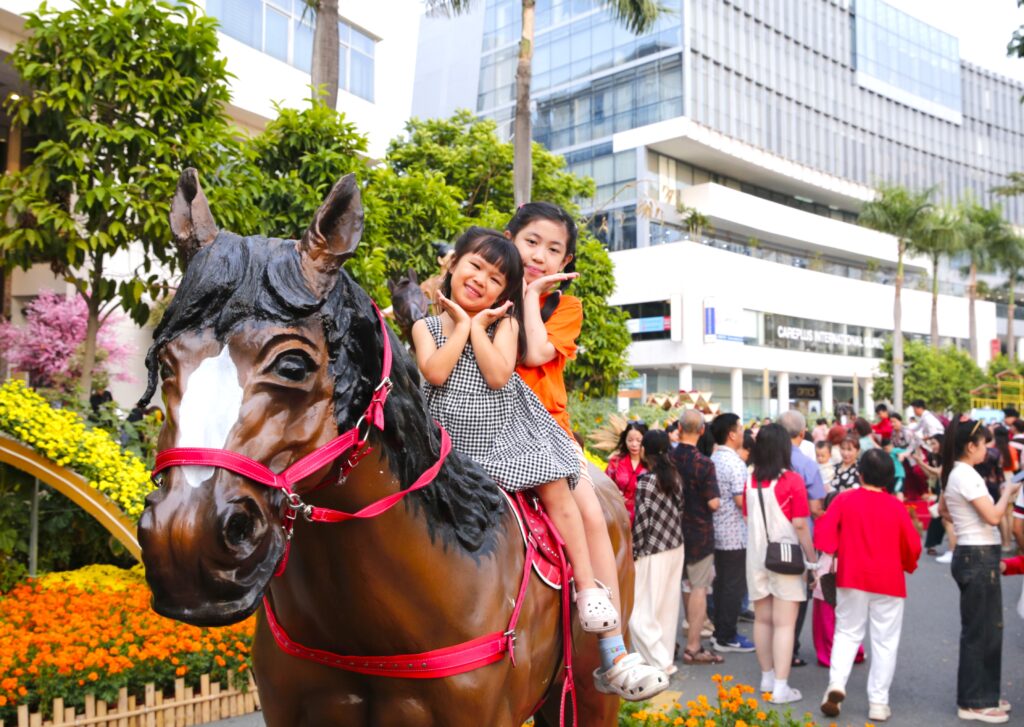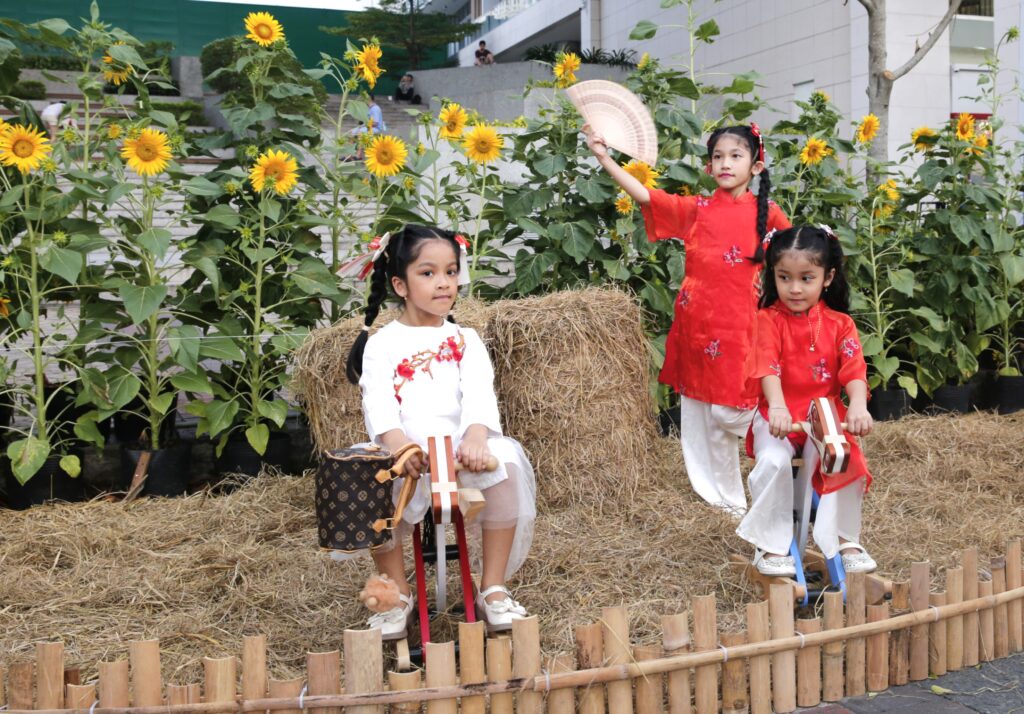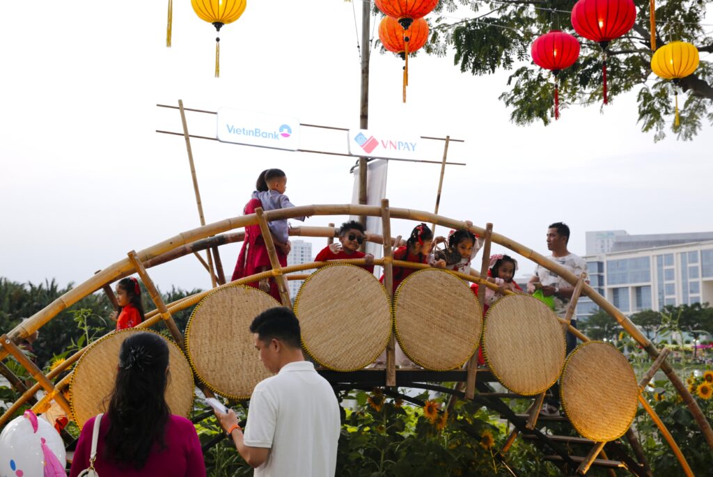 Không chỉ có những tiểu cảnh tôn vinh các giá trị văn hóa truyền thống như Thánh Gióng, phố ông Đồ, xe thổ mộ… Đường hoa Phú Mỹ Hưng còn dành riêng một khu trò chơi dân gian dành cho các bé thiếu nhi. Tại đây, các em nhỏ được thỏa thích vui chơi, khám phá không gian xuân rực rỡ và lưu lại những khoảnh khắc hồn nhiên, đáng yêu bên cha mẹ.