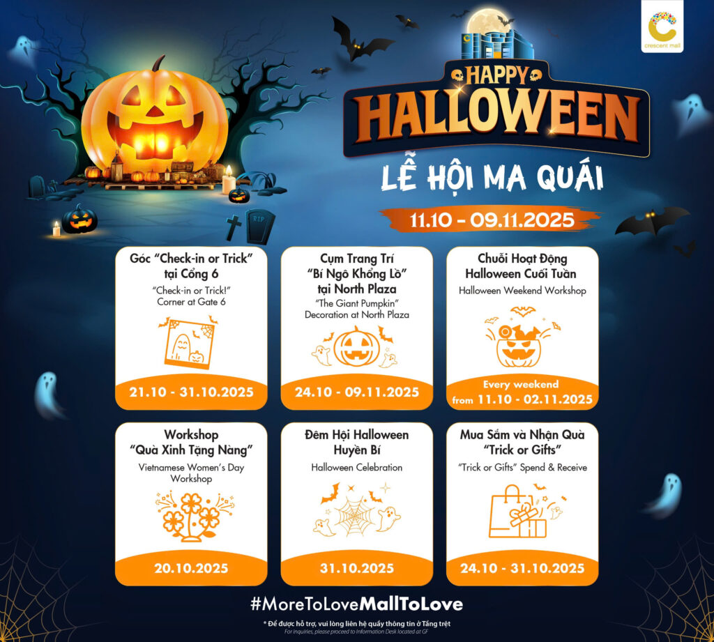 Từ nay đến hết ngày 9/11/2024, Trung tâm Thương mại Crescent Mall mang đến cho khách tham quan không gian Halloween sống động với sắc cam – đỏ đặc trưng cùng nhiều hoạt động vui chơi hấp dẫn tại sảnh B, tầng trệt.